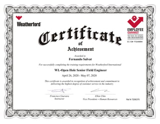 Fernando Salvat completed training requirements to become a Weatherford International WL-Open Hole Senior Field Engineer from April 26 to May 07, 2020. He was awarded a certificate in recognition of achieving the training and committing to providing excellent customer service in the oilfield services industry. The certificate was signed by his instructor Francisco Guevara and Ellen Chin, Vice President of Human Resources at Weatherford International.