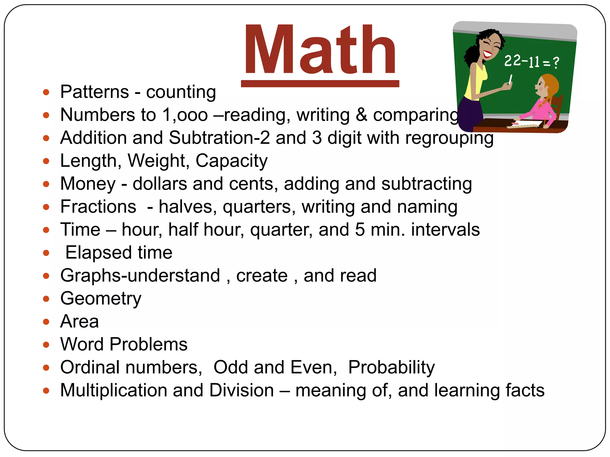 Second grade students will learn math topics including patterns, numbers up to 1,000, addition, subtraction, length, weight, capacity, money, fractions, time, graphs, geometry, area, and word problems. They will study reading comprehension, vocabulary, phonemic awareness, and literature. Students will have spelling tests weekly and learn writing skills through the six trait model. Science units will cover animals, weather, dinosaurs, sound, and the ocean. Social studies will focus on history, geography, civics, government, and economics. Homework will be sent home on Mondays and due on Fridays, along with weekly spelling assignments.