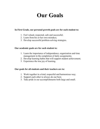 This document provides information about the first grade class of 2012-2013 at an unspecified school. It lists the 17 students in the class and outlines goals for students' personal growth, academics, and working together. It also discusses communication methods, classroom rules, iPad usage rules, homework expectations, and the daily schedule. The document closes by covering topics like sharing, celebrations, and opportunities for parents to volunteer in the classroom.