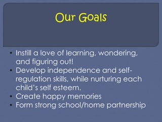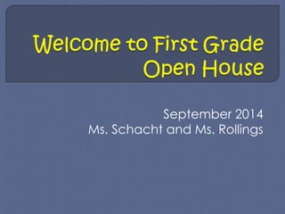 This document provides information for parents about the goals and schedule for an elementary classroom. It outlines the classroom's schedule, which includes subjects like Spanish, art, music, and technology on different days. It also details what students will bring home each day including homework, and encourages parents to check folders daily. Homework usually includes reading, math, and other assignments. The document provides information about various reading, math, and writing programs the classroom uses. It encourages family involvement and lists the teachers' email addresses for scheduling appointments.