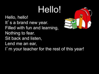 Mrs. Reid is the teacher for the new class. She provides information about herself, the classroom schedule, subjects to be covered, and expectations for homework and supplies. Backpacks will have color-coded tags with student information. The supply list, classroom rules, and homework policies are outlined. Reading logs will be used to track books read at home.