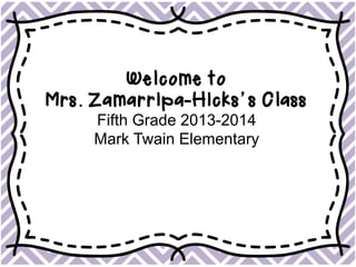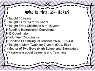This document provides an overview of Mrs. Z-Hicks's fifth grade class for the 2013-2014 school year at Mark Twain Elementary. It details her teaching experience and qualifications, the daily schedule including subjects like math, science, and social studies. It outlines the IB units of inquiry covered and grading policies. It also provides information about technology used in the classroom and opportunities for parent involvement.