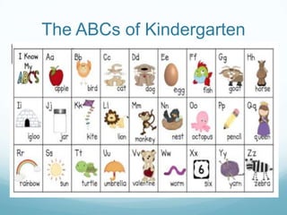This document provides information for parents about their child's kindergarten class. It outlines topics from A to Z, including attendance expectations, celebrations, homework, communication methods, conferences, rules and expectations. It introduces the teacher, classroom volunteers, technology used and emphasizes the importance of parent involvement through questioning children about their day.