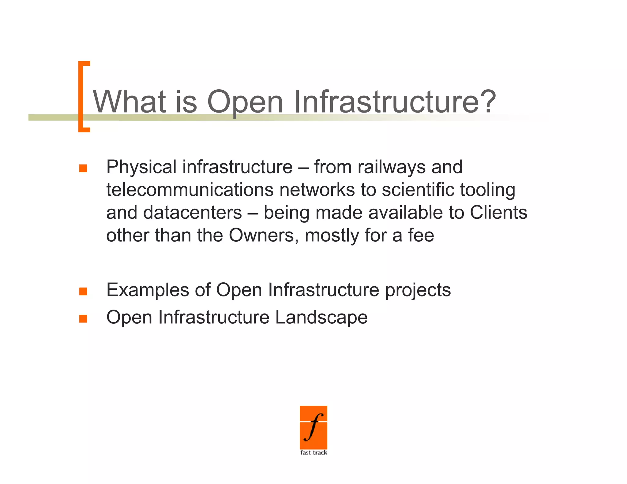 The document discusses the concept of open infrastructure, which refers to making physical infrastructure accessible to various clients, often for a fee. It provides examples of different open infrastructure projects, such as Berkeley Open Infrastructure for Network Computing, UNICORE/OMII for supercomputing resources, and UTOPIA for fiber access in Utah. These projects aim to promote competition, scientific research, and technological advancement while differing in ownership structures and funding sources.