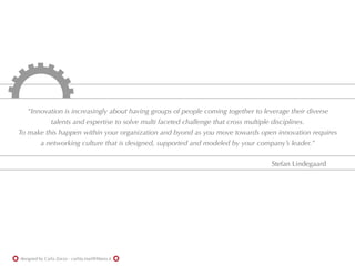 Open innovation requires organizations to leverage diverse talents from within and beyond their boundaries to solve complex challenges. Leaders must foster a networking culture to enable open innovation. This involves integrating external resources and fresh inputs into internal research to set the right questions. An interconnected open innovation system provides advantages like engagement, knowledge exchange, and new opportunities through connections between companies, individuals, clients, business services, and government.