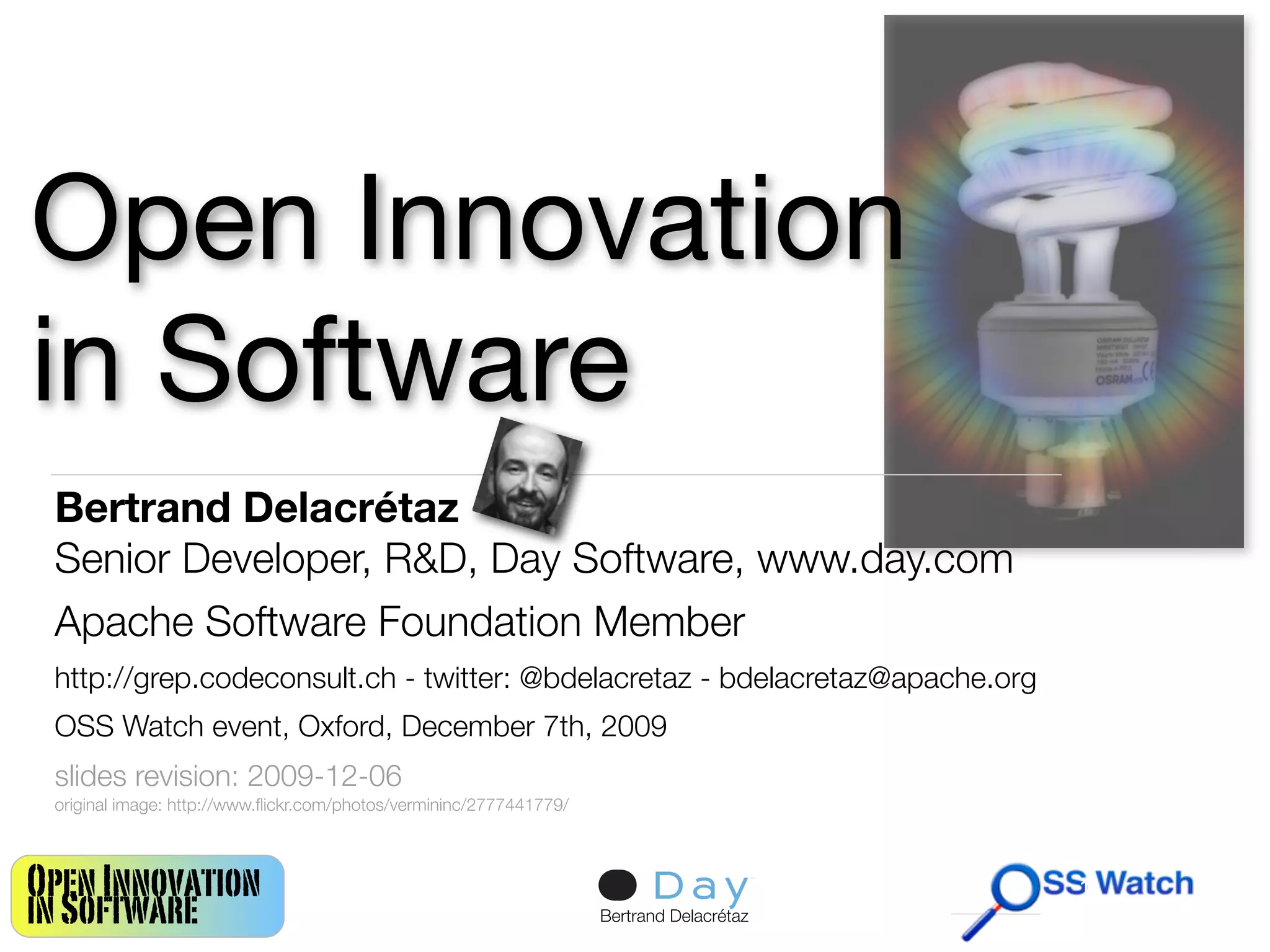 The document discusses open innovation in software, emphasizing the integration of external and internal ideas to enhance technology through open-source collaboration and meritocratic communities. It highlights the importance of feedback and quick iteration in innovation processes, particularly within open-source environments like the Apache Software Foundation. The presentation also showcases Day Software's approach to leveraging open innovation for content delivery and product flexibility.