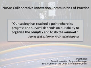 The document discusses NASA's approach to collaborative innovation, emphasizing the complexity and chaos inherent in working together for shared goals. It highlights the need for diverse thinkers, patience, and an acceptance of conflict as necessary ingredients for innovation. The text also outlines opportunities for collaboration, such as the International Space Apps Challenge, promoting collective efforts to address significant challenges in various mission categories.