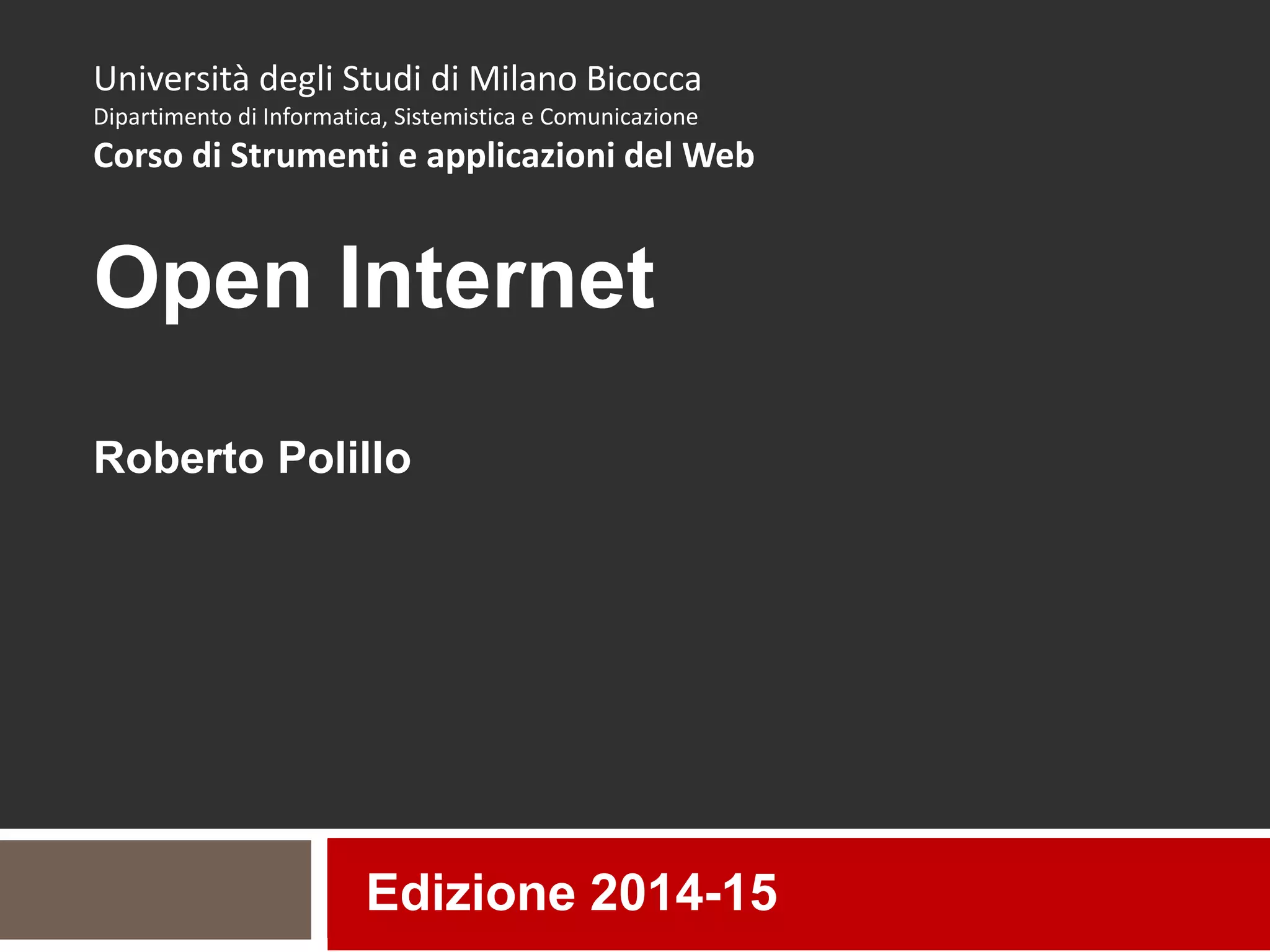 Il documento riguarda il corso 'Strumenti e applicazioni del web' dell'Università degli Studi di Milano-Bicocca, evidenziando l'importanza della creatività e della condivisione nell'era di Internet. Discute i principi della filosofia 'open', come il riuso delle opere e il ruolo delle licenze Creative Commons, insieme alle sfide legate alla protezione della proprietà intellettuale. Viene inoltre trattato il tema del software open source e delle sue diverse anime, sottolineando l'importanza di un accesso libero e trasparente alla tecnologia.