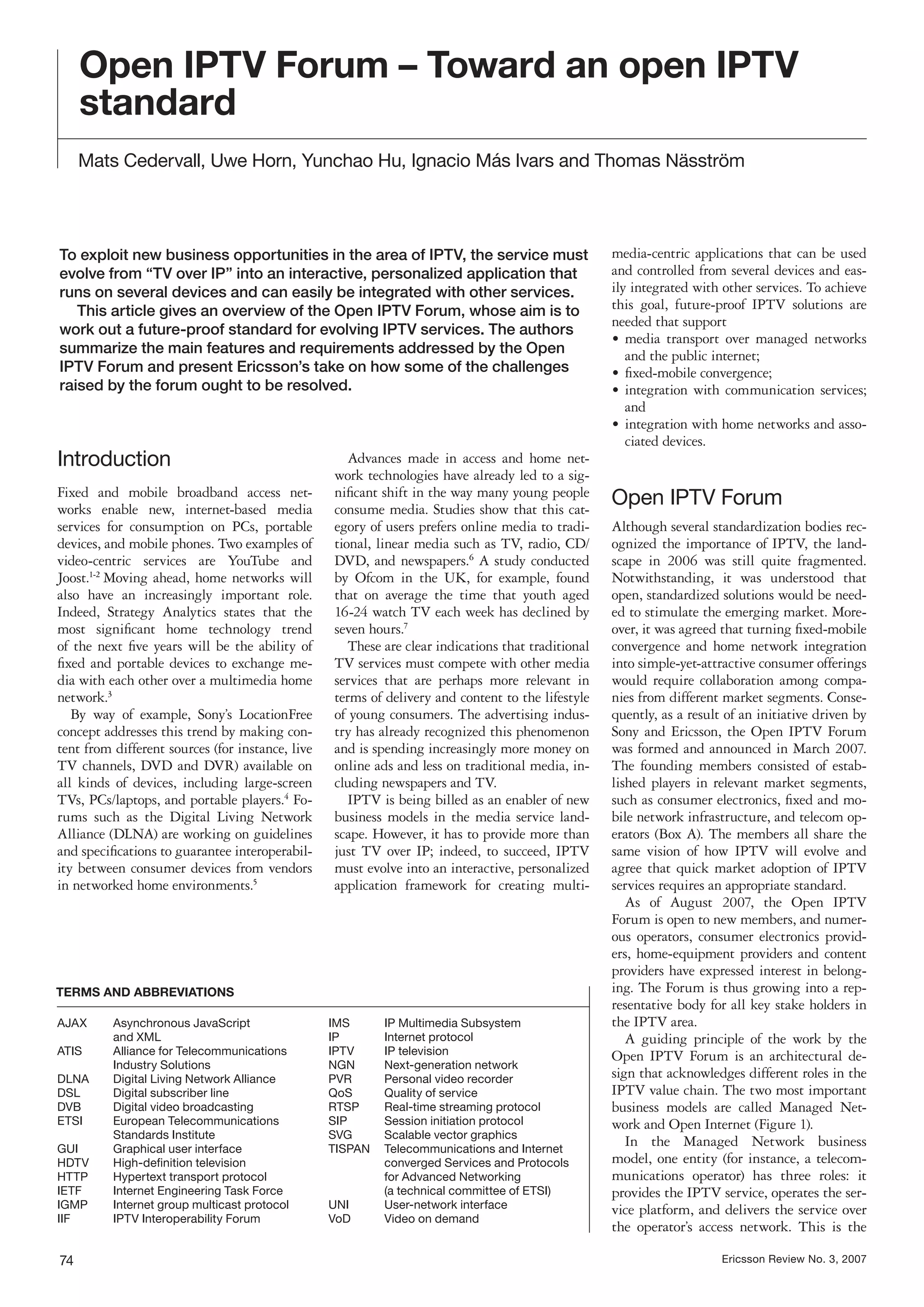 The Open IPTV Forum aims to establish a future-proof standard for IPTV services, transitioning from traditional TV over IP to more interactive, personalized applications. Key features include media transport over managed networks, fixed-mobile convergence, and integration with communication services and home networks. As of August 2007, the forum is expanding its membership to include various stakeholders, sharing a vision for a unified IPTV market and addressing challenges through collaborative standards development.