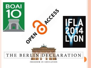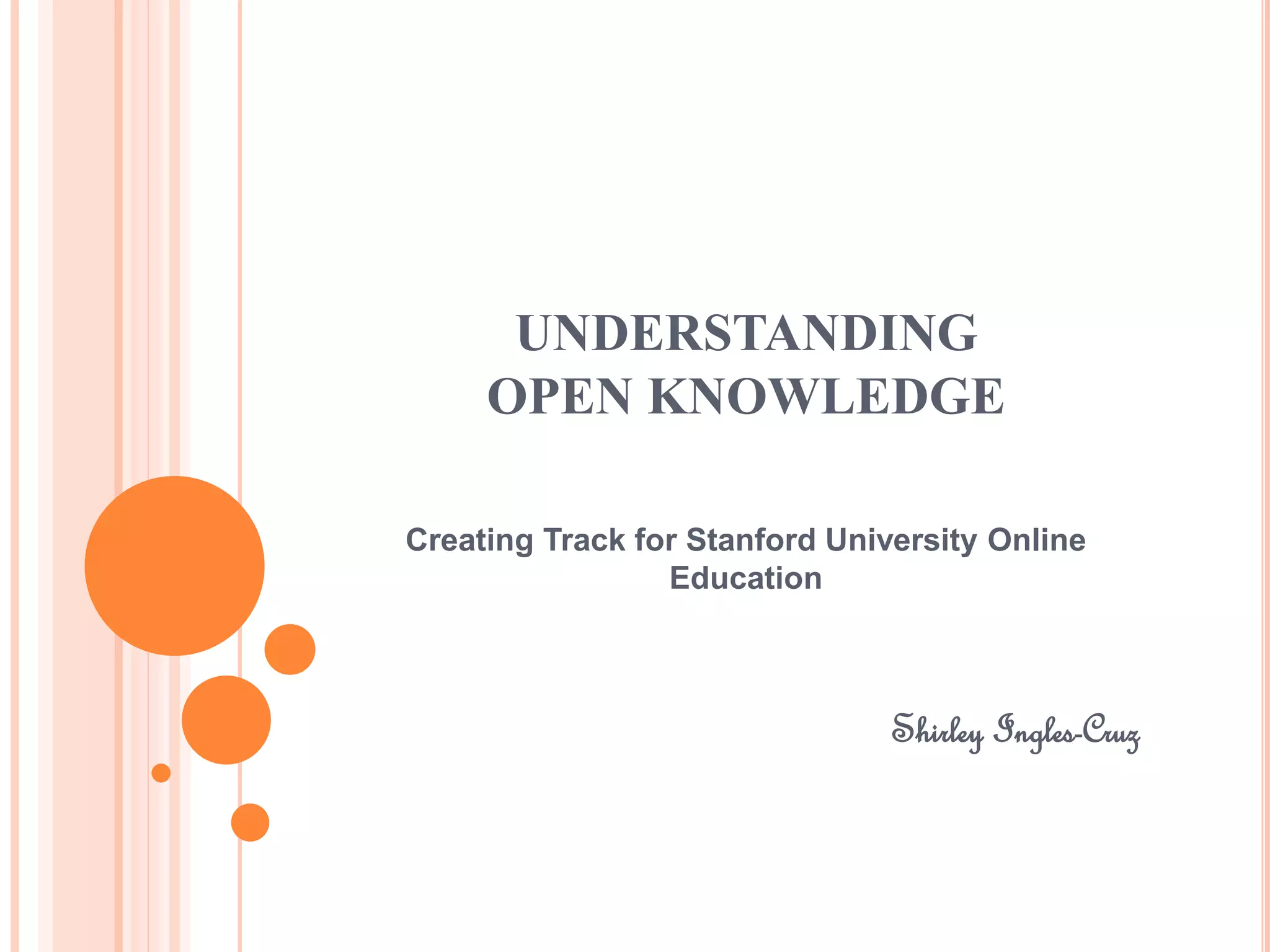 Open knowledge refers to content that is freely available for people to use, modify, and share. It contributes to universal access to information and freedom of information exchange. The document discusses several key aspects of open knowledge, including its definition in relation to open source, the types of knowledge, and factors that contribute to open knowledge such as open educational resources, open access, citizen journalism, and open licensing and copyright policies.