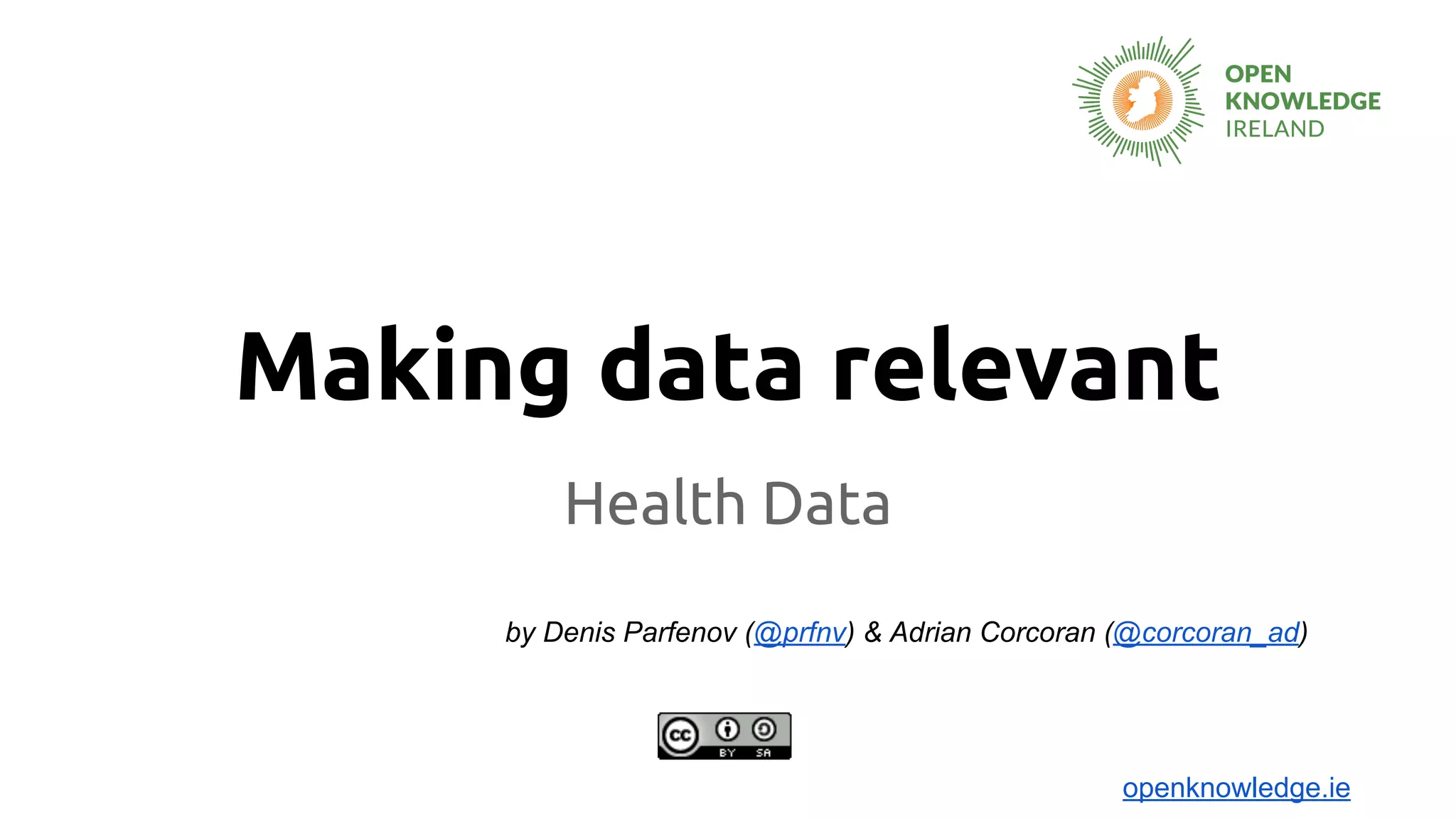 This document discusses making health data more relevant and accessible. It lists tools like data.gov and data.gov.uk that provide open government data. It also mentions an Open Data Census that evaluates open data in Ireland and skills resources like the School of Data and Open Data Handbook. Additionally, it references a pilot project to make hospital waiting list data more open and an upcoming Maker Party event to work on accessing and analyzing hospital data.