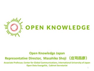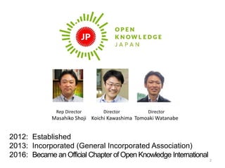 Open Knowledge Japan is a non-profit organization established in 2012 to promote open data and knowledge in Japan. It is led by Representative Director Masahiko Shoji and has provided policy recommendations and assistance to governments, created an open data index, and hosted numerous community events like an open data talk series and International Open Data Day to encourage data sharing.