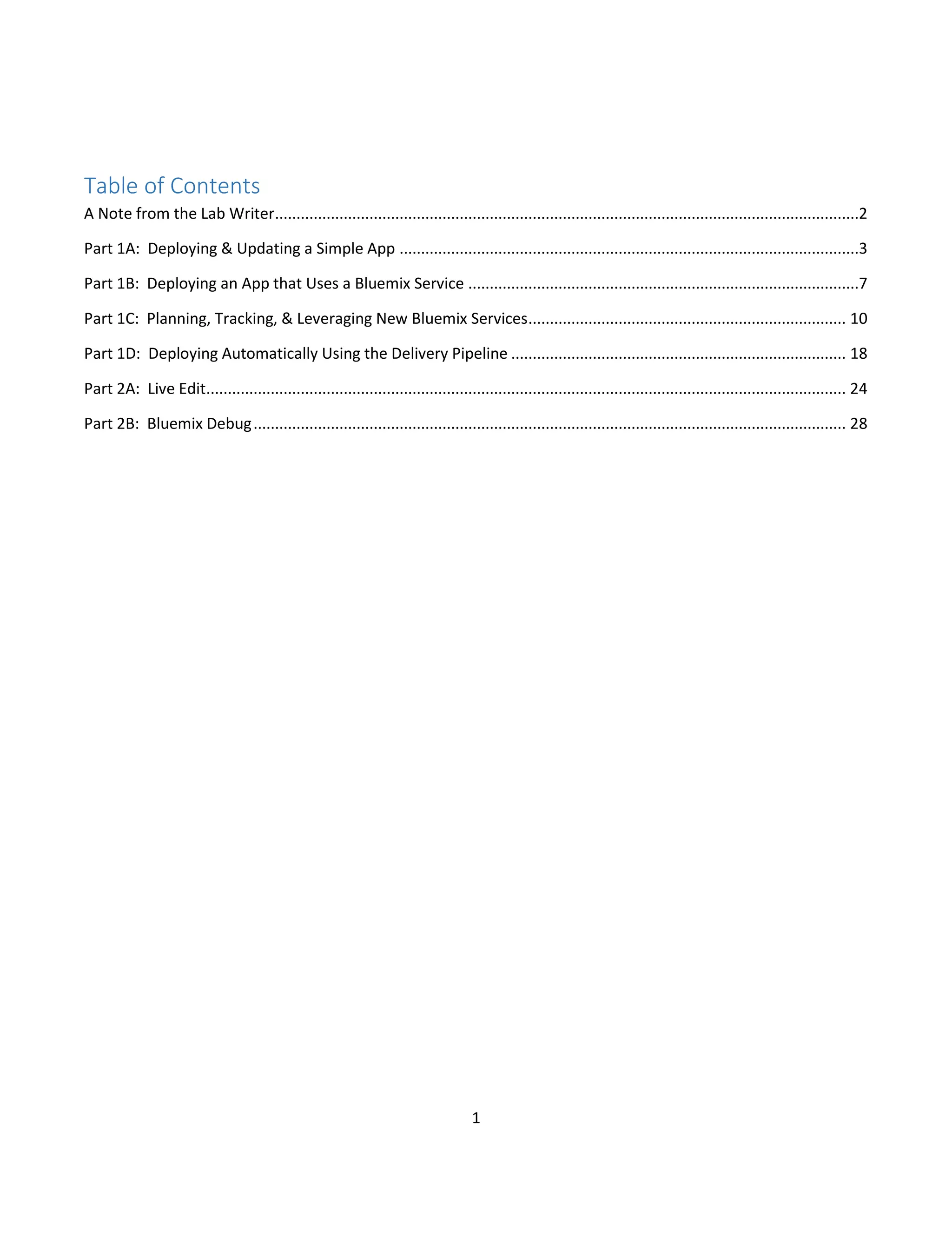 This document provides an introduction to using IBM Bluemix DevOps Services to deploy applications. It is broken into multiple parts that build on each other. Part 1 walks through deploying a simple application and one that uses a Bluemix service. It also demonstrates how to plan and track work using DevOps Services. Part 2 introduces live editing and debugging capabilities for Bluemix applications. The overall lab guides users through common DevOps tasks like deploying apps, making changes, using services, and automating processes.