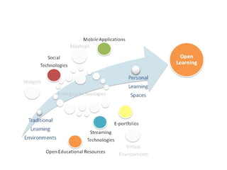 This document discusses open learning and e-learning, and creating innovative intersections between them. It defines open learning as making education more accessible and student-centered. Open learning allows learners more control over their learning process by delivering opportunities when and how they need them. The document highlights examples of open universities and open courseware consortiums that are removing barriers to education. It also discusses how web-based technologies and Web 2.0 tools can support open and collaborative learning models, and provides examples of how these tools have been used. The focus is on creating lifelong learning communities and designing open learning experiences and portfolios using available digital tools.