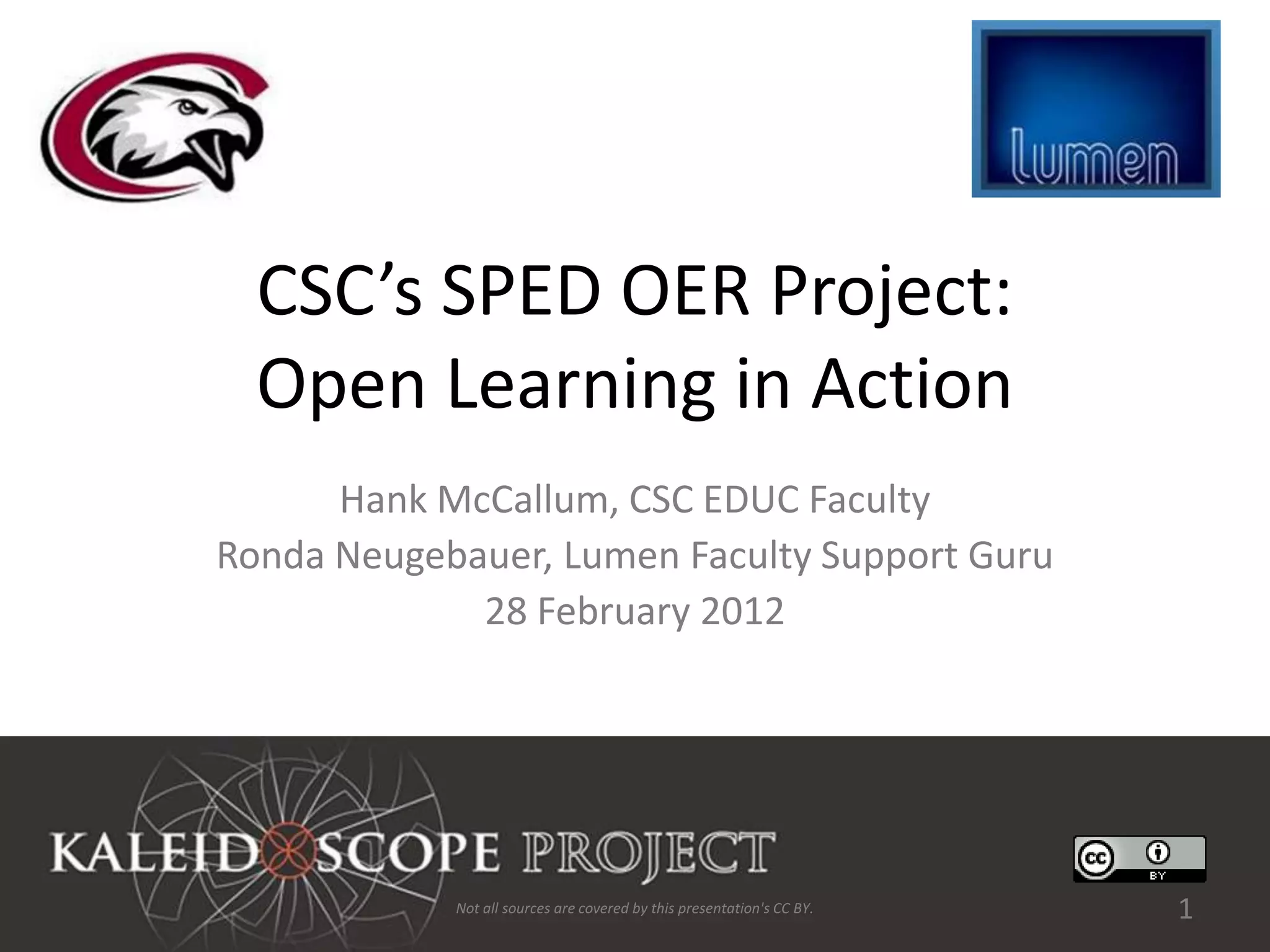 This document outlines a project at Chadron State College to transition courses to using open educational resources. The college president was convinced by a conference on open education to adopt a "Textbook Zero" model. A professor was tasked with leading the transition working with an education technology company. The project, called "Open Learning in Action", had students develop open education courses using instructional design methodology and publishing their work with Creative Commons licenses. It aimed to improve learning through collaborative design of open resources.