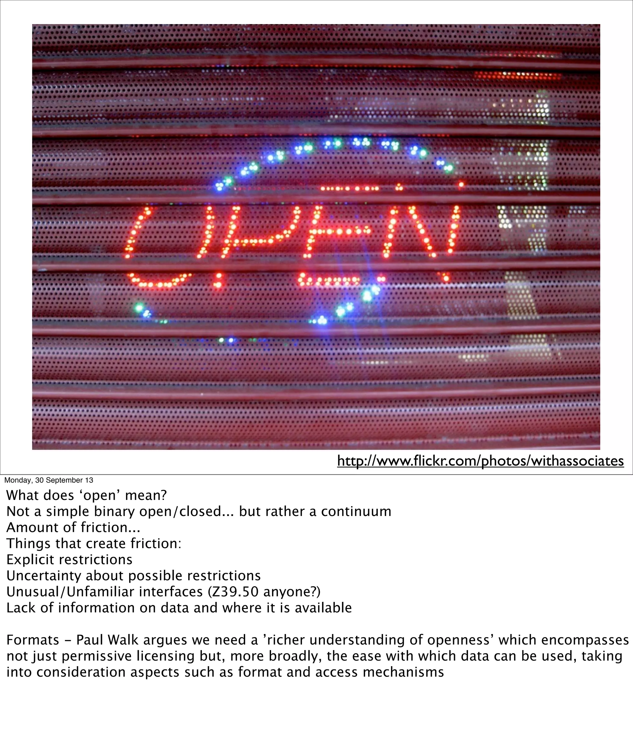 The document discusses the concept of 'open' data, emphasizing the continuum of openness rather than a binary classification of open/closed. It highlights survey findings on the preferred licensing for data access and the necessity to support multiple formats for data usability. Additionally, it describes the organization of hack days to foster engagement between developers and data providers, promoting innovative use of open data.