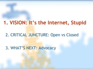 The document discusses how the internet has transformed communications and democracy by giving users more control over information than ever before. It argues that protecting an open internet is crucial for democratic participation and that current policies will determine whether the future of media and democracy remains open or closed. The advocacy role is to organize around principles of access, openness, innovation and choice to legally protect a neutral internet that is affordable and fosters innovation for all users.