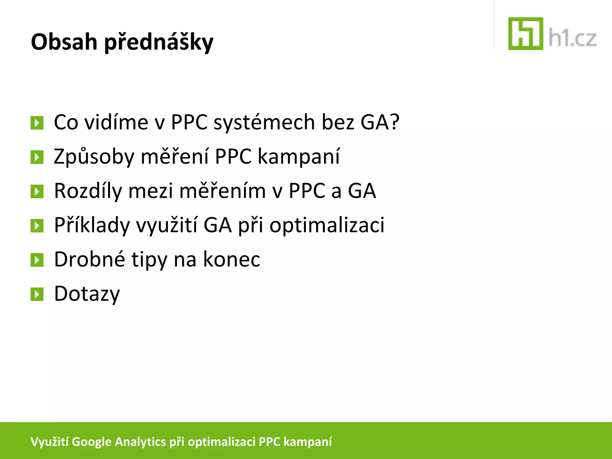 Zapnutím měření konverzí v PPC systémech se dozvíme, zda nám kampaně vydělávají, či na nich tratíme a můžeme pomocí nich kampaně optimalizovat. I přesto, že je možné vybudovat výdělečnou kampaň pouze s použitím těchto údajů, měřicí a analytické systémy na našem webu nám pomohou návštěvníky z PPC poznat a umožní nám tak získat z kampaní daleko více. David Velechovský ve své přednášce hovořil o měření v oblíbeném systému Google Analytics, o rozdílech v metrikách, na které byste si měli dát pozor, a ukázal praktické ukázky mnohostranného využití na několika příkladech.