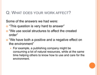 The document discusses the outcomes of work based on Ecclesiastes 2:1-11. It notes that the Teacher found pleasure in his struggles but ultimately found his achievements to be meaningless. His work provided fulfillment through struggle, reputation by surpassing others, and consumption by denying himself no pleasure. However, it was all futile in the end.