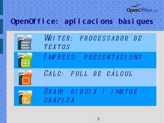 Open office 1. 2. 3. 4. En tractar-se de programari lliure, la seva descàrrega és gratuïta i es poden realitzar lliurament còpies, millores i redistribució, tot respectant la llicència copyleft. 5. 6. 7. 8. 9. Capacitat d'accedir a fitxers creats amb MS-Office fins versió XP-2003, i fins i tot de crear fitxers amb aquest format. 10. El paquet ofimàtic es troba traduït a més de 90 llengües, amb diccionaris per correcció automàtica al català permanentment actualitzats 11. 12.
