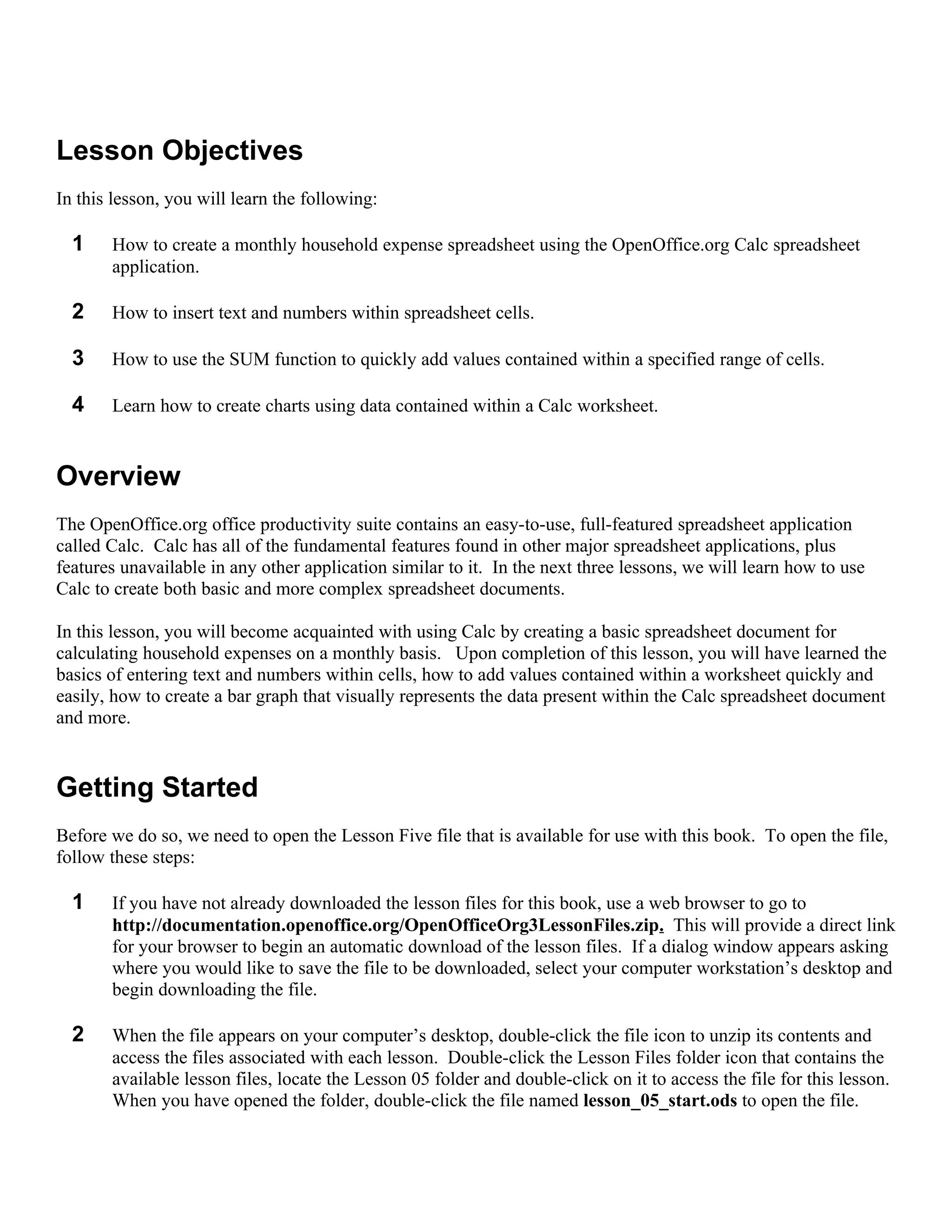 This document provides instructions for creating a monthly household expense spreadsheet using OpenOffice Calc. It will teach how to enter text and numbers in cells, use the SUM function to add cell values, and create charts from worksheet data. The lesson has students complete a sample budget spreadsheet by entering expense categories and amounts for each month to become familiar with basic Calc functions.