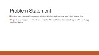 The document discusses how to open SharePoint documents within a Windows 8/8.1 Metro app using a web view. It outlines the necessary steps for seamless login and accessing Office web apps, which include saving cookies and creating an HTTP request message. Sample code is provided to illustrate the process of navigating to the SharePoint document URL within the web view.
