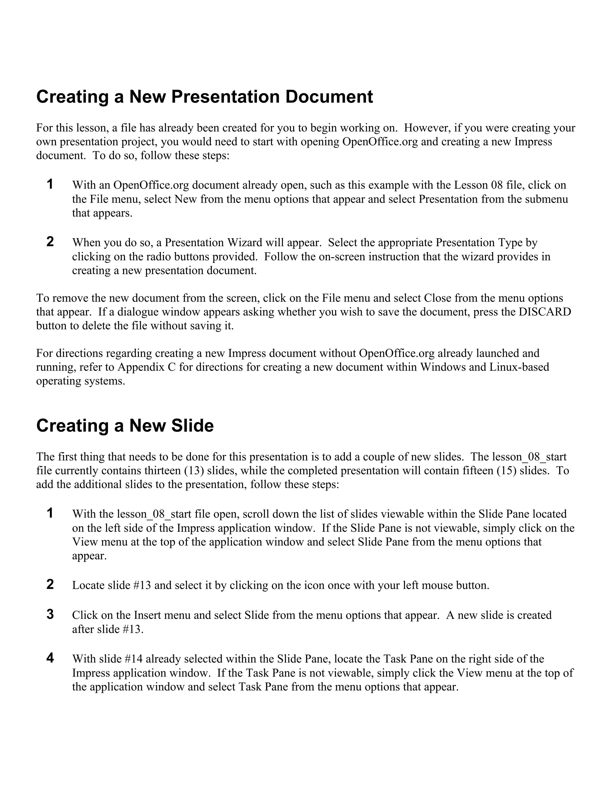 The document then provides step-by-step directions for opening an example Impress file, adding two new slides, entering and formatting slide titles, and applying text effects like shadows.