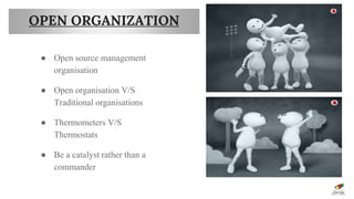 This document discusses open organizations and how they differ from traditional organizations. Open organizations practice open source management and act as catalysts rather than commanders. They also function like thermostats that adapt to changing conditions, unlike thermometers that simply measure temperature.