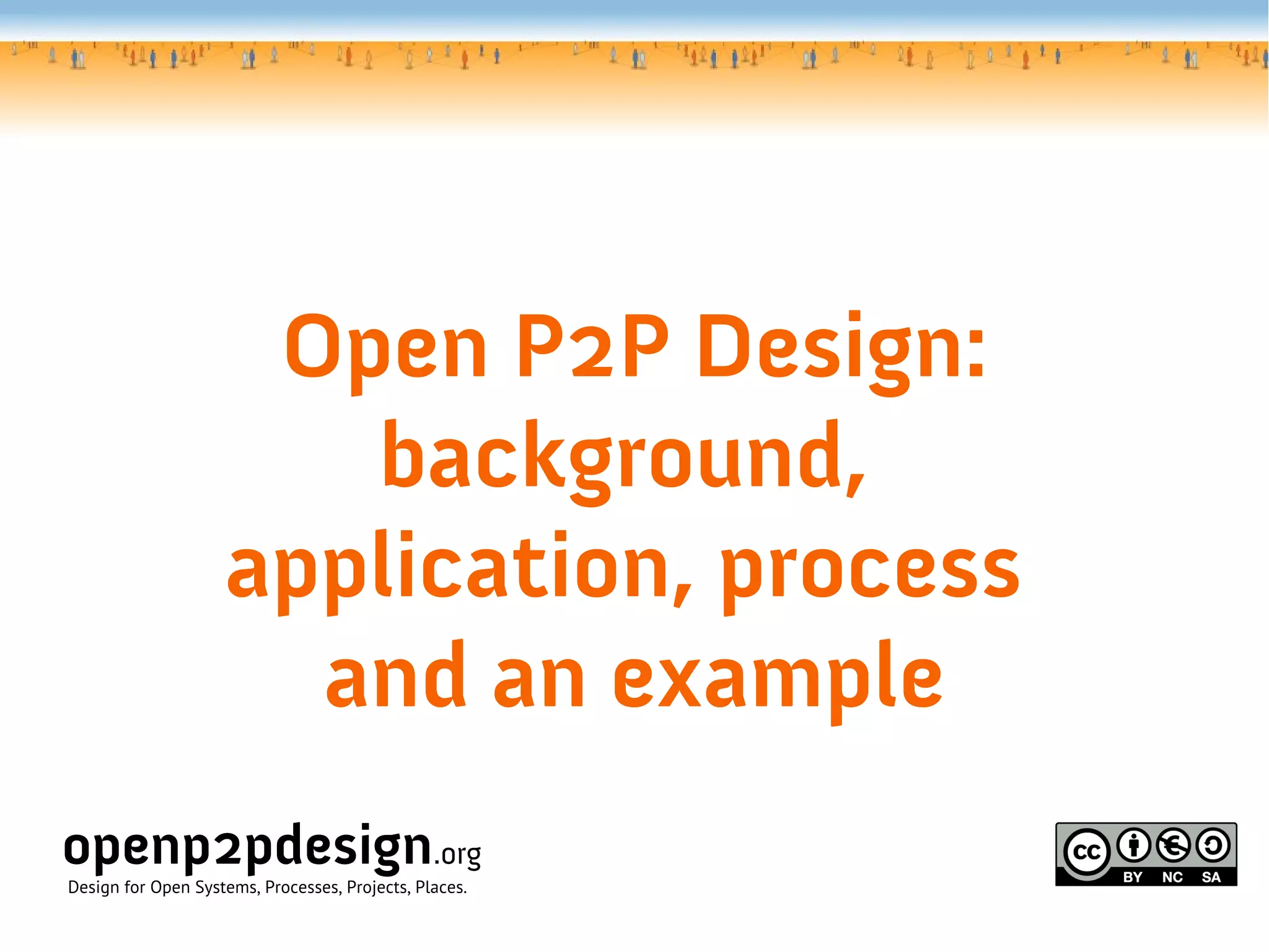 This document provides an overview of open P2P design processes and methodologies. It begins with background on concepts like crowdsourcing, web 2.0, open source software development and their relation to design. It then discusses open design projects and the current status of open design. The document proposes that open P2P design can be used to design open, collaborative projects and processes. It presents open P2P design as a metadesign approach that can be used to design the tools, processes and systems for open design projects. Finally, it provides examples of using an open P2P design process, including activity analysis and system mapping tools.