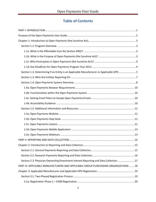 This document provides an overview and user guide for the Open Payments (Sunshine Act) program. It explains that Open Payments promotes transparency in financial relationships between healthcare industry and providers by publishing payment data. Applicable manufacturers, GPOs, physicians, and teaching hospitals participate by registering, reporting applicable payment data, and reviewing/disputing data. Key deadlines and a two-phase registration/reporting process applied to the first reporting year of 2013. The guide details each step of the Open Payments process.