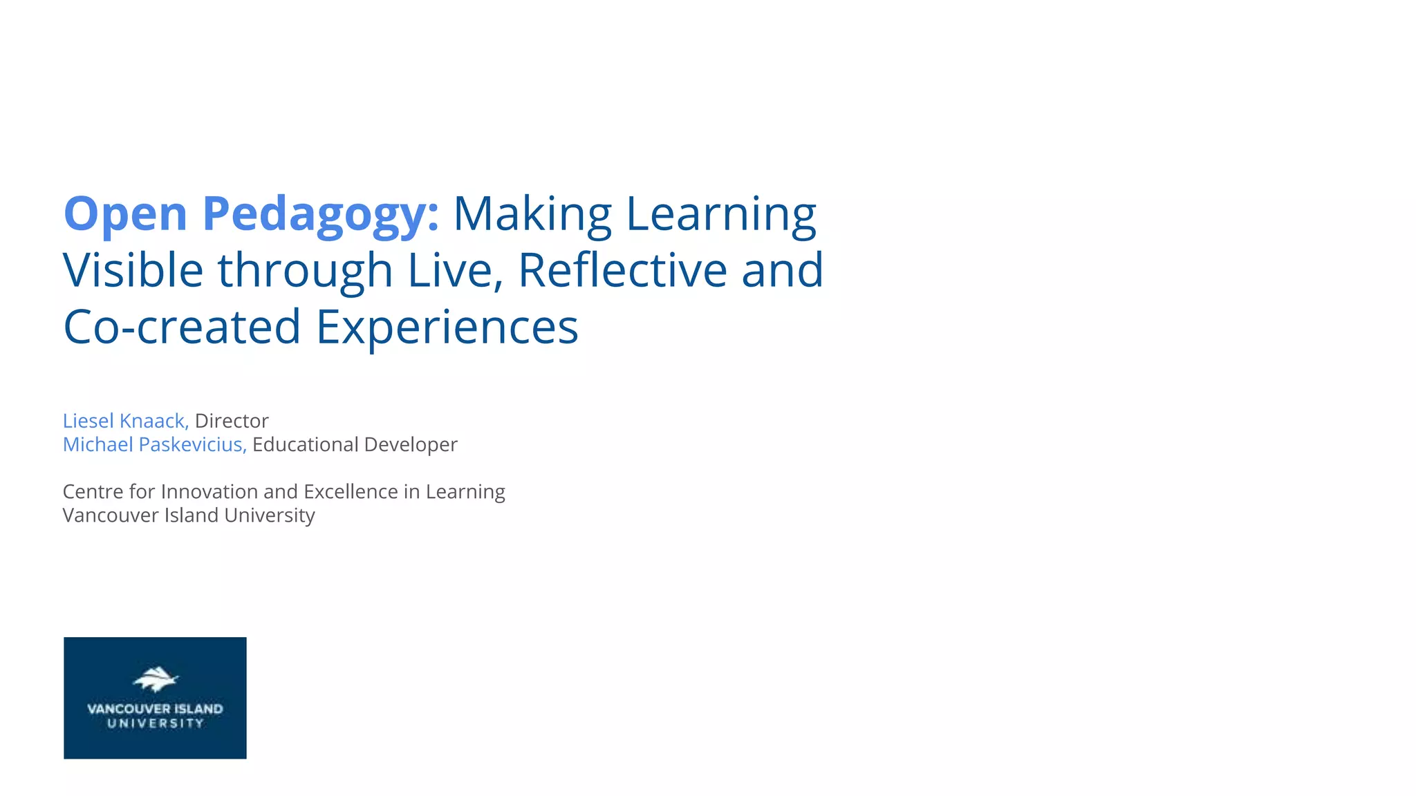 The document discusses open pedagogy as a method for enhancing learning through live, reflective, and co-created experiences. It emphasizes the importance of engaging students with an authentic audience and the representation of knowledge. Various aspects of open educational resources and practices, along with definitions and case studies, are explored to provide insights into implementing open pedagogy in educational settings.