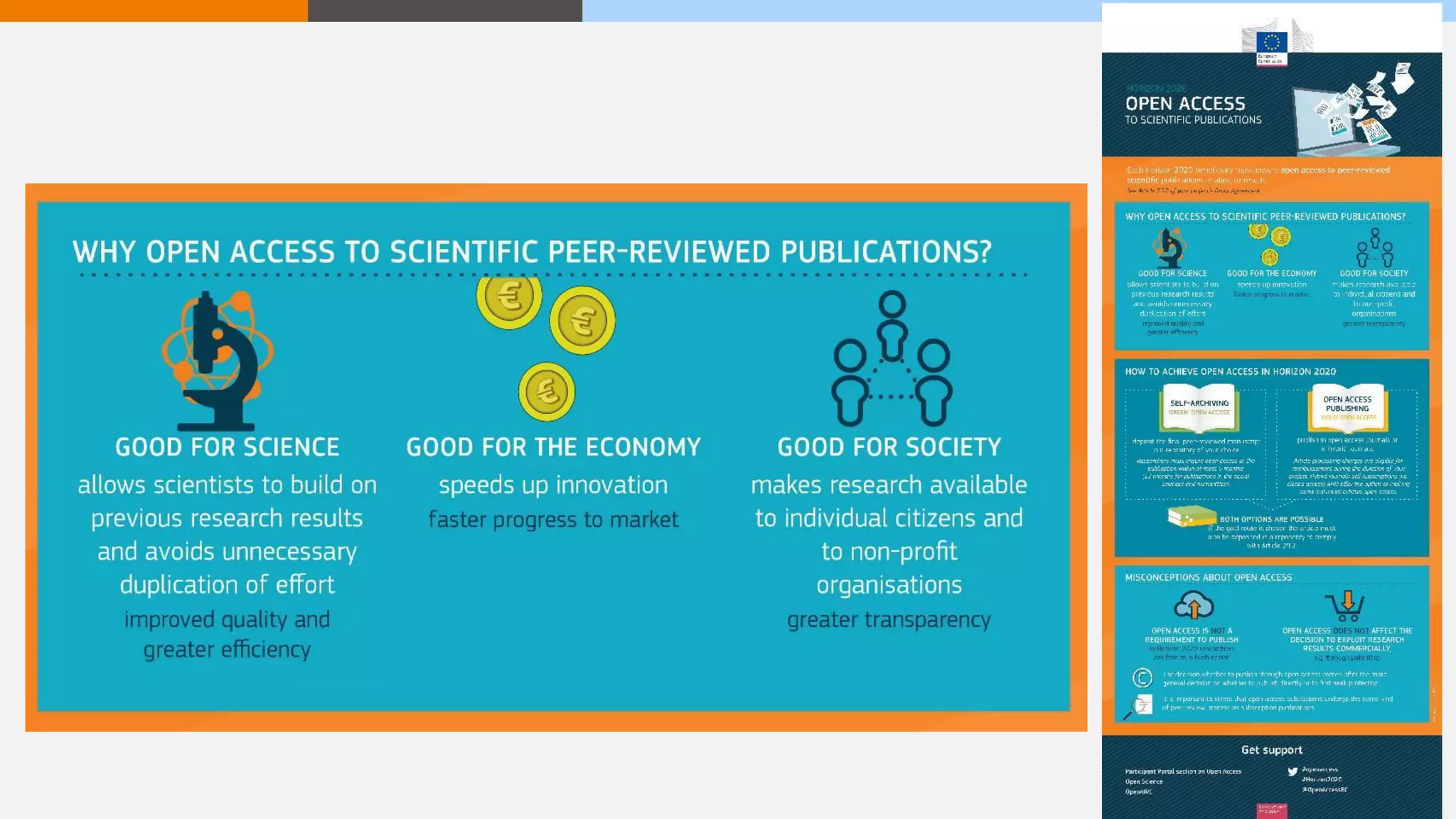 This document provides an overview of open science policies and requirements in Horizon 2020, the EU's research and innovation program. It discusses open access to publications and research data. For publications, beneficiaries must provide open access either immediately (gold) or after an embargo period (green) by depositing the publication in an institutional or subject repository. They can choose between open access publishing or self-archiving. Article processing charges for open access publishing are eligible costs. The document reviews support available through OpenAIRE, including tools to link publications and data to projects and monitor open access compliance.