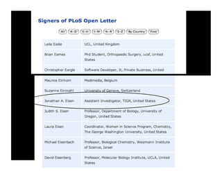 The document discusses open science and open access. It provides examples of open science like open access publishing, open notebooks, prepublication data release, and open source software. It discusses three aspects of open science: cost, restrictions, and timing. It discusses the costs of publishing, creative commons licenses, and examples of organizations that promote open access like the Public Library of Science (PLoS) and how they circulated an open letter to encourage open access. Overall, the document discusses the history and concepts of open science and open access.