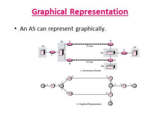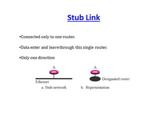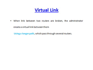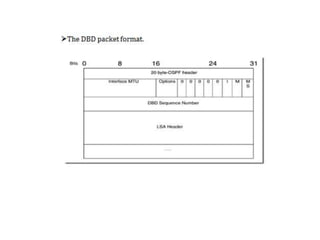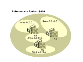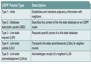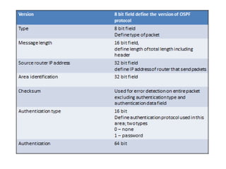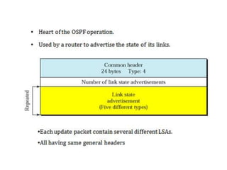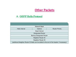 OSPF is an intra-domain routing protocol that uses a link-state algorithm to calculate the shortest path to destinations within an autonomous system. It divides an autonomous system into areas to limit routing updates and allows for route summarization between areas. OSPF uses hello packets to discover neighbors, database description packets to exchange routing information, link-state request packets to request updates, and link-state acknowledgment packets to acknowledge receipt of updates.