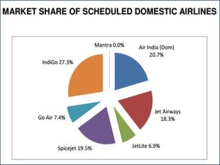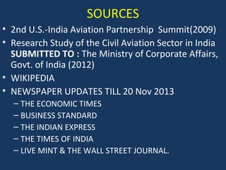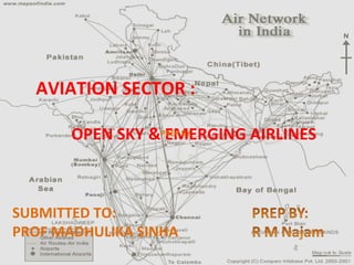 This document provides an overview of the aviation sector in India. It discusses the impact of liberalization policies in the 1990s in opening the sector to private players. Key developments include the growth of low-cost carriers, new joint ventures between foreign and domestic airlines like Jet-Etihad and Tata-AirAsia, and plans to improve regional connectivity through new regional airports and regional airlines. The aviation industry is projected to continue strong growth in the coming years driven by rising passenger and cargo traffic.