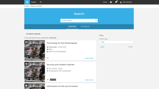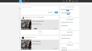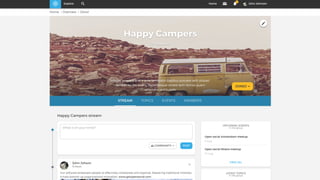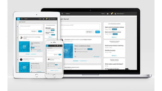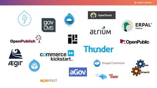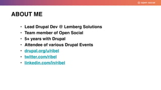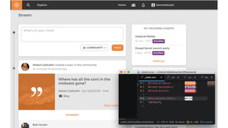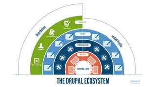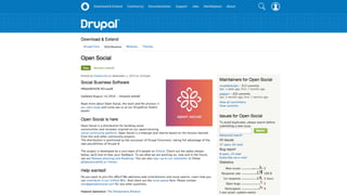 The document presents a new Drupal 8 distribution for building social networks and intranets, emphasizing the importance of making Drupal distributions work for future relevance. It outlines key features such as personalized content, group creation, and powerful search capabilities, along with development tools and processes involved in creating the distribution. Additionally, it introduces the concept of OpenSaas, highlighting easy setup, branding, training, and support services associated with this open-source software model.