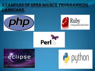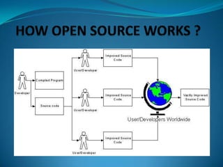 Open source refers to software where the source code is openly available and can be modified or customized by users. It provides freedoms for users to use, study, share, and improve software. Some key open source projects include Linux, Android, Mozilla Firefox, and OpenOffice. Open source offers advantages like lower costs, interoperability, and customizability while potential disadvantages include lack of warranty and support. Common myths about open source include that it is unreliable, unsupported, and not used by big companies.
