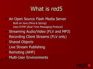Red5 is an open-source Flash media server built on Java, utilizing RTMP for streaming audio and video. It includes functionalities like shared objects and multi-user environments, and requires a specific directory structure for application development. The document outlines the steps for building a Red5 application, detailing key configuration files and coding aspects for integrating custom Java functions and ActionScript connections.
