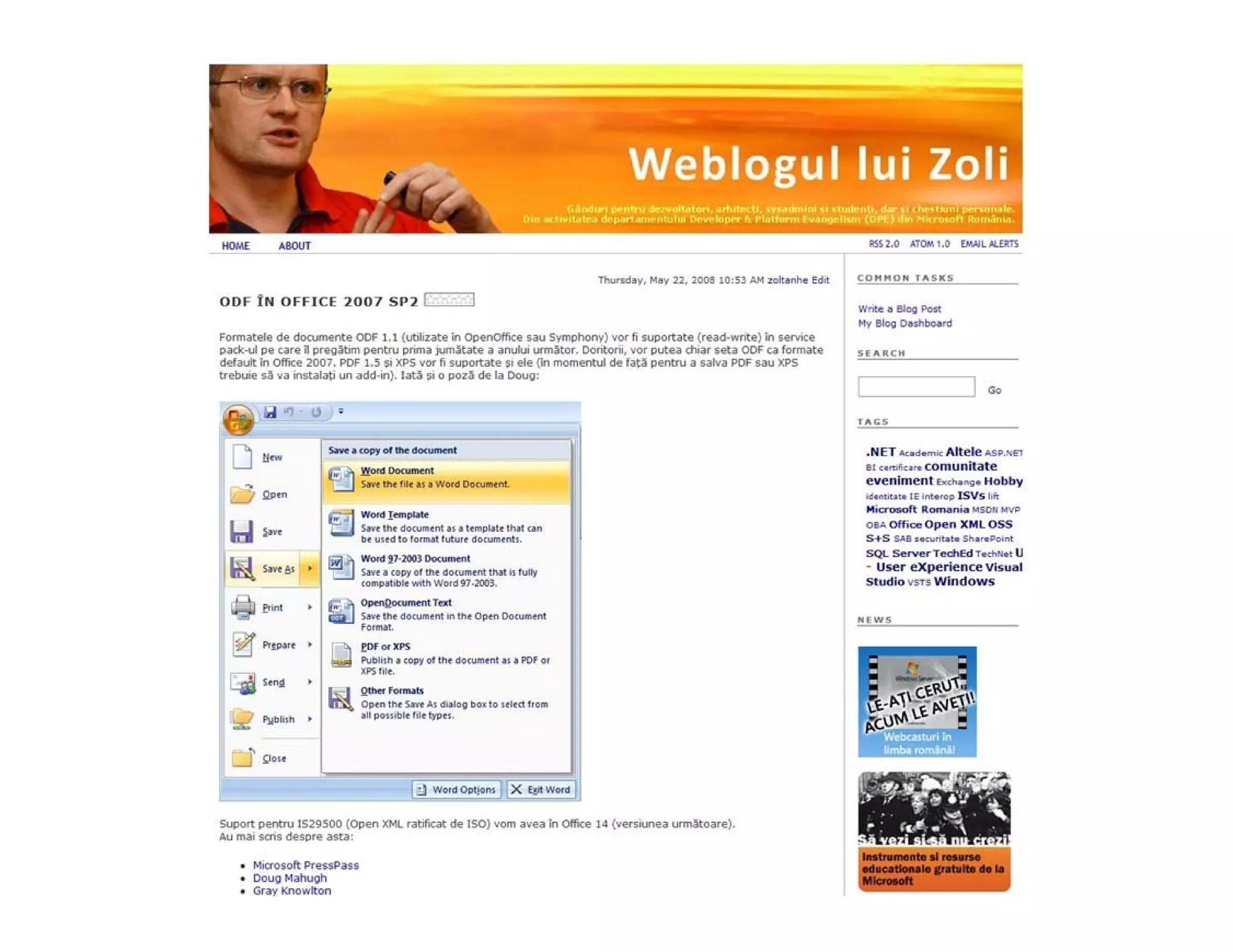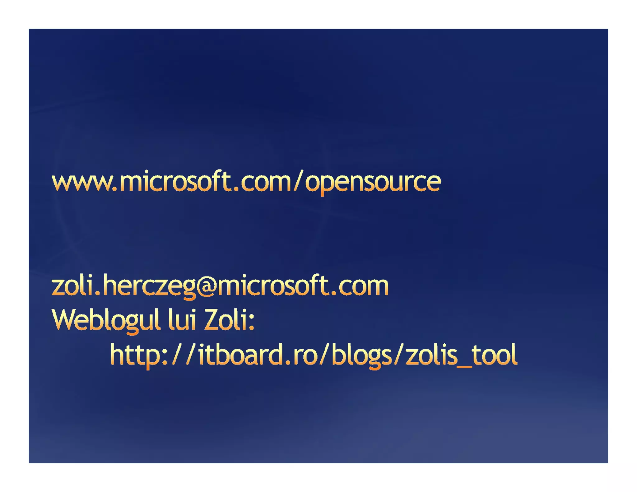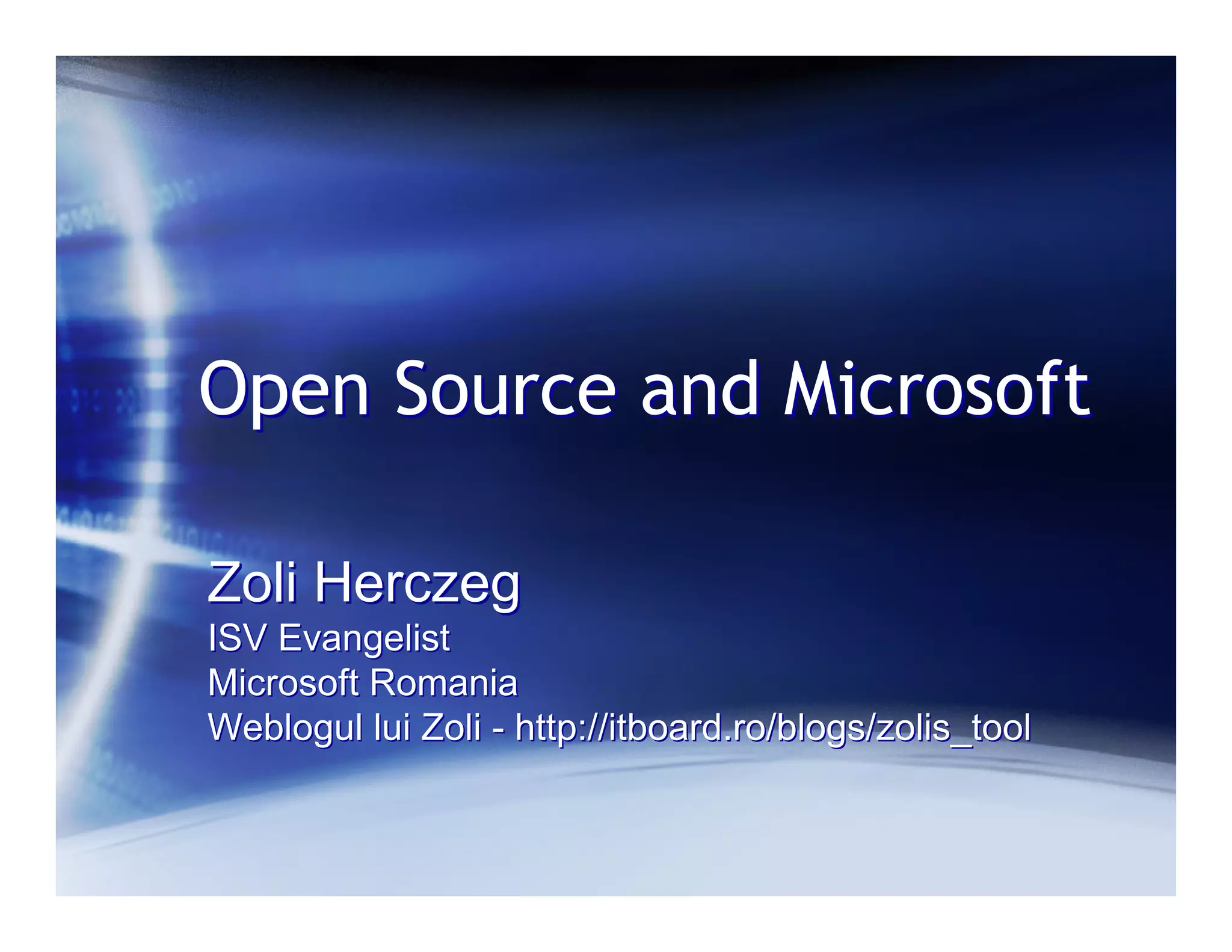 Microsoft acknowledges the vital role of open source software and its developers in the tech industry, as expressed by Zoli Herczeg in his blog. The document outlines various initiatives, partnerships, and tools developed by Microsoft to enhance interoperability between Windows and open source technologies from 2001 to 2008. Additionally, it provides data on community engagement and promotes collaboration within the software development community in Romania.