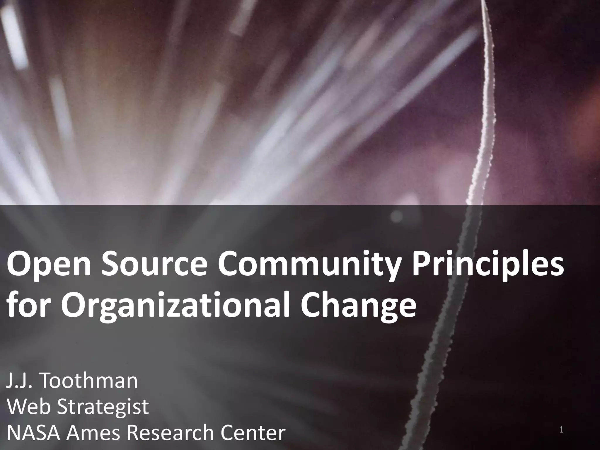 The document outlines open source community principles for organizational change. It advocates decentralizing control while centralizing information. The principles provide opportunities for participation and transparency. They encourage structured deliberation and dispute resolution. The principles also provide access to raw materials, allow redistribution, and permit forking. Upper management should tune the parameters of communication to support these open source community principles.