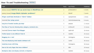 The document compares two popular open source content management systems, WordPress and Drupal. It discusses their communities, use of web standards, themes and customization options, and other features. Both systems have large, active communities that contribute to their ongoing development. WordPress uses web standards and has an easy-to-use interface for creating themes. Drupal provides more flexibility and power through its module system and theming architecture, which allows for deeper customization.