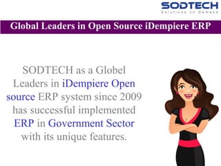 Sodtech has been a leader in implementing the iDempiere open source ERP system in government sectors since 2009, showcasing successful integrations with third-party applications like Tally and various CRMs. The ERP is tailored for advanced government needs such as finance, payroll, and asset management, and has been successfully integrated with core banking systems in India. Sodtech claims to have numerous satisfied customers, including notable organizations, and offers demos for their ERP solutions.