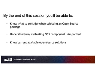 The document is a comprehensive guide on evaluating open source software (OSS), detailing considerations for selecting OSS packages, including licensing, security, and community health. It emphasizes the importance of assessing OSS components to ensure they meet specific needs, while also providing tools like CHAOSS and OpenSSF Scorecard for evaluation. The guide outlines various risks associated with OSS usage and provides resources to mitigate these risks effectively.