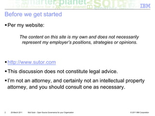 The document discusses the importance of establishing proper governance for the use of open source software within organizations. It emphasizes the need for legal controls, uniform policies, employee education, and a supportive governance process to manage the associated risks and responsibilities. Additionally, it shares insights from IBM's experience in contributing to open source projects and evolving their governance strategies over time.