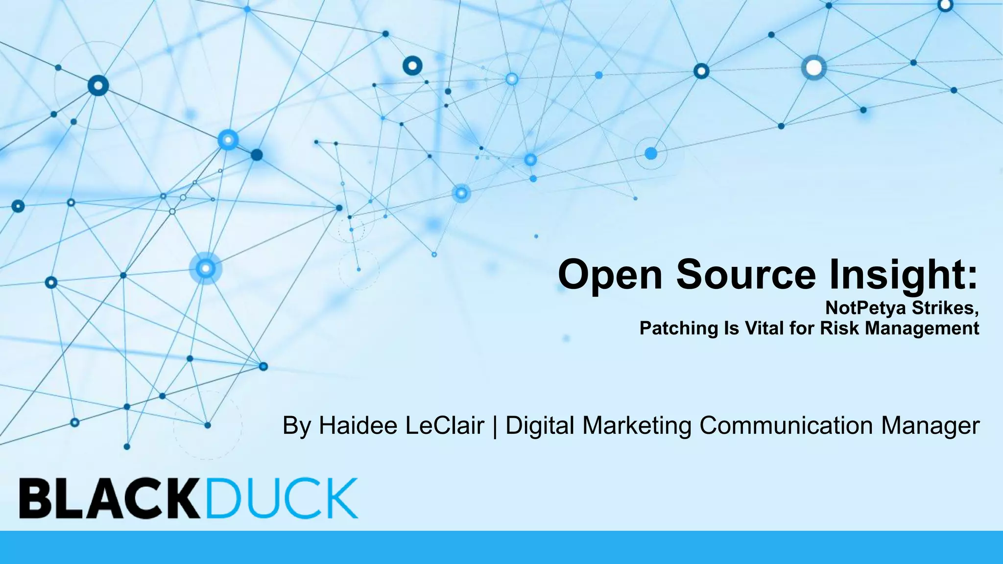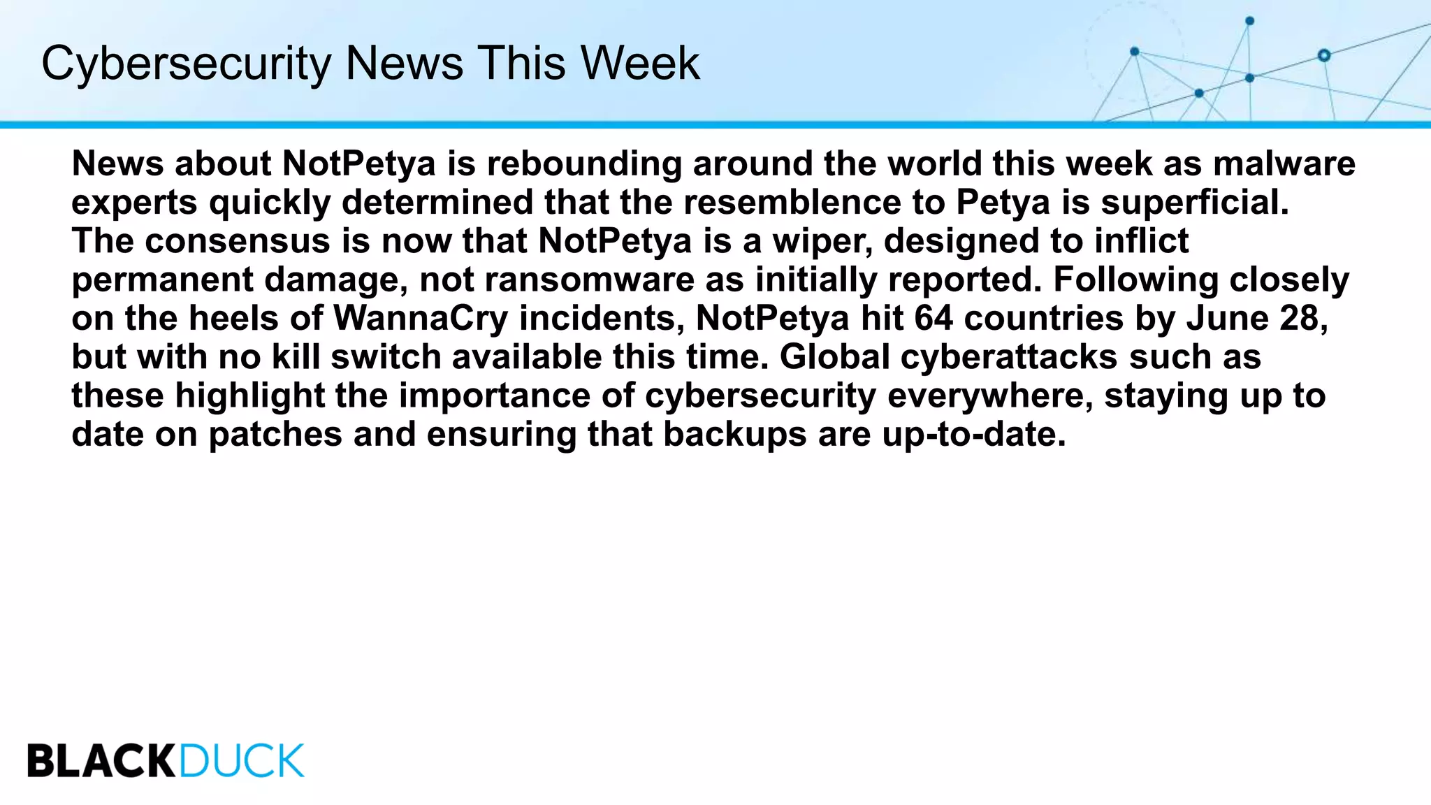 The document discusses the NotPetya cyberattack, identified as a destructive wiper rather than ransomware, affecting 64 countries and emphasizing the need for cybersecurity vigilance and timely patching. It highlights the pervasive use of open source software across industries, particularly in the automotive sector, and the associated security risks that remain largely unaddressed. The piece also touches on the rising scrutiny of open source code in light of geopolitical tensions, particularly in relation to US and Russian tech interactions.