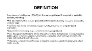 Open-source intelligence (OSINT) refers to information gathered from publicly available sources including social media sites, traditional media, maps, government reports, and academic papers. OSINT tools are used to gather intelligence from these sources through activities like searching metadata, websites, and databases. Common OSINT tools mentioned are Maltego for relationships, Google Hacking Database for search operators, Metagoofil for document metadata, Shodan for devices, Spiderfoot for automation, TheHarvester for online profiles, and FOCA for hidden information. While useful, OSINT has limitations like information overload and potential false positives.