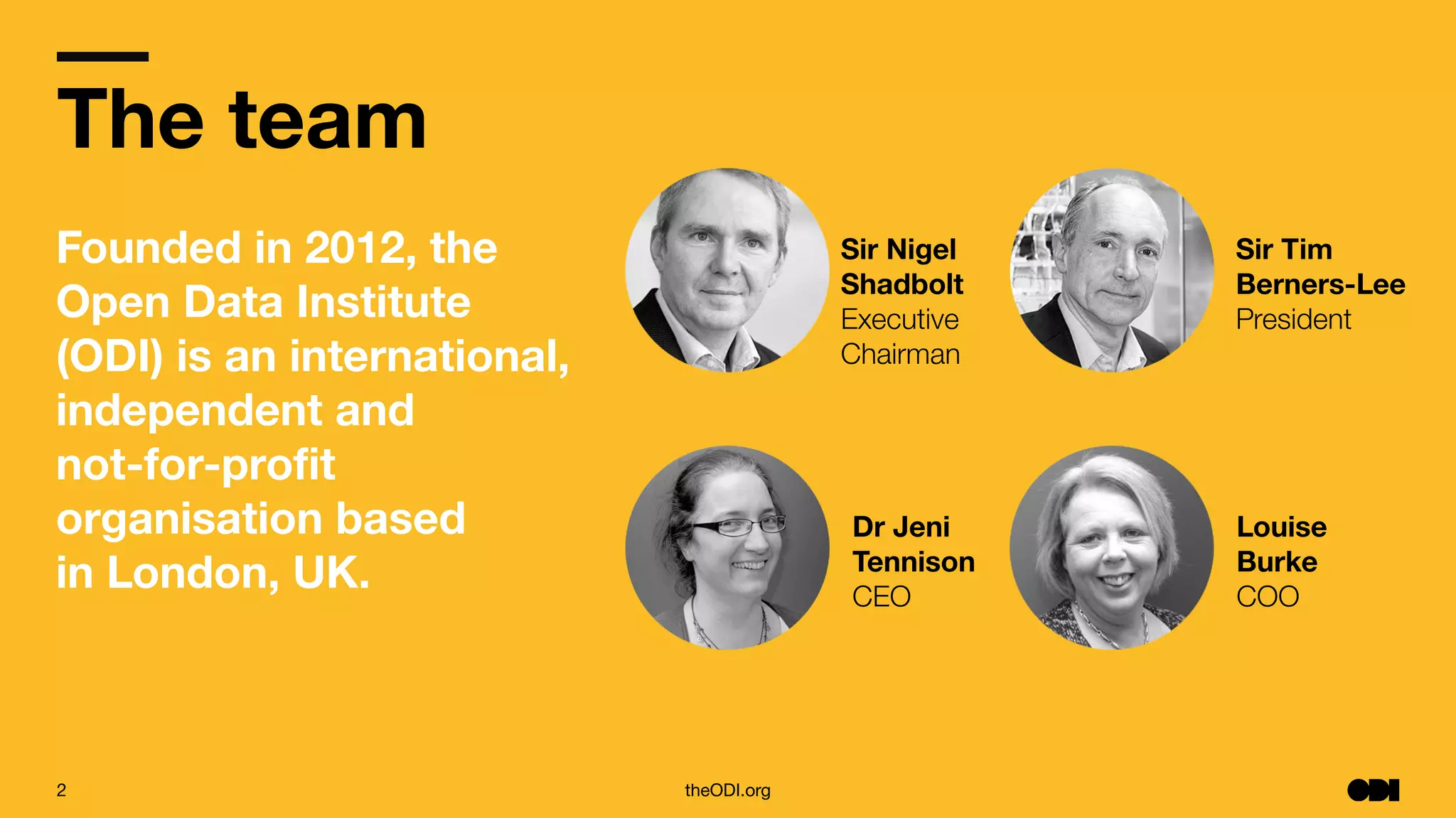 The Open Data Institute (ODI) is a nonprofit organization based in London that works to build an open, trustworthy data ecosystem. The ODI conducts research on how cities can use data to redesign public services and maps data ecosystems to help people understand them. The ODI advocates for making government data open whenever possible to help make better policy decisions, but recognizes that not all data can be open and an ethical, balanced approach is needed.