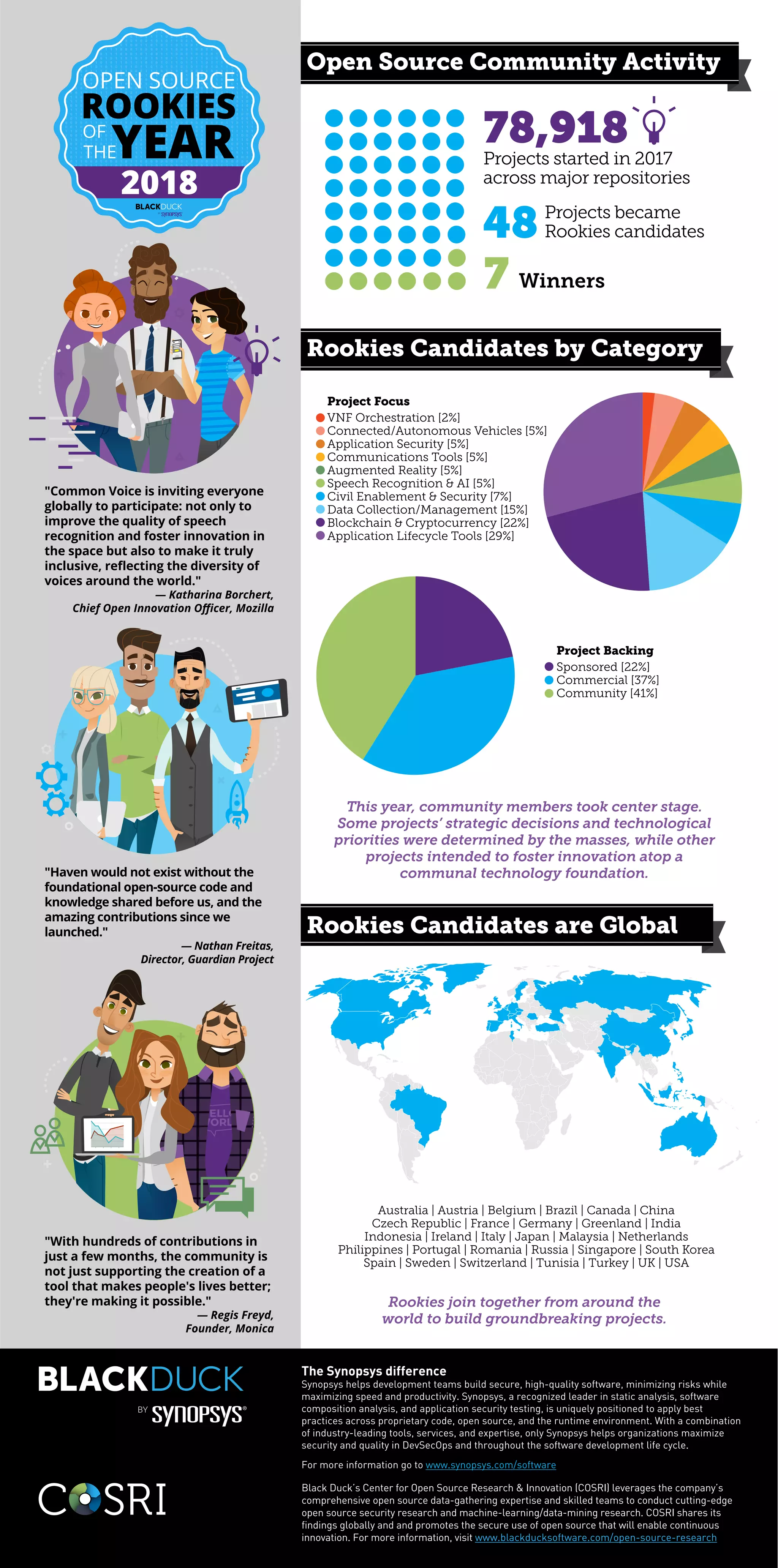 The document discusses a variety of rookie candidates aiming to build innovative projects within categories such as blockchain, application security, and data management. It highlights the role of the global open-source community in shaping technological priorities and fostering collaboration. Additionally, it emphasizes the importance of inclusive participation in improving technologies like speech recognition.