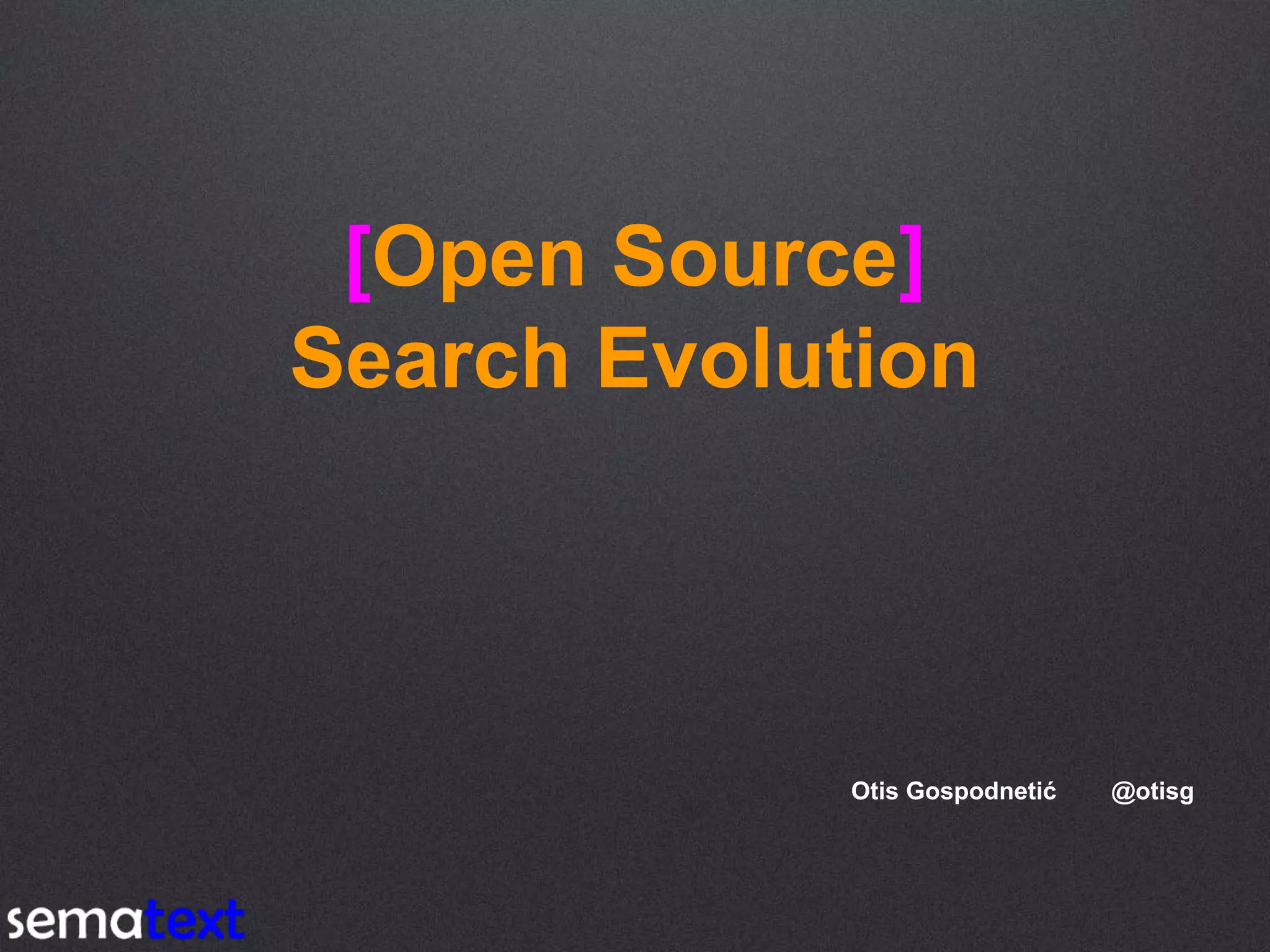 This document summarizes the evolution of open source search tools from the early 1970s to present day. It discusses the transition from early tools like WAIS and Harvest in the 1990s to modern distributed search platforms like Elasticsearch. Key areas of advancement are highlighted, such as support for more languages through improved stemming and lemmatization, more sophisticated relevance algorithms, distributed architectures for scaling data and queries, faster indexing and real-time search, reduced memory footprints, and expanding capabilities beyond basic text search to include geospatial, classification, recommendation, key-value storage, analytics and more.