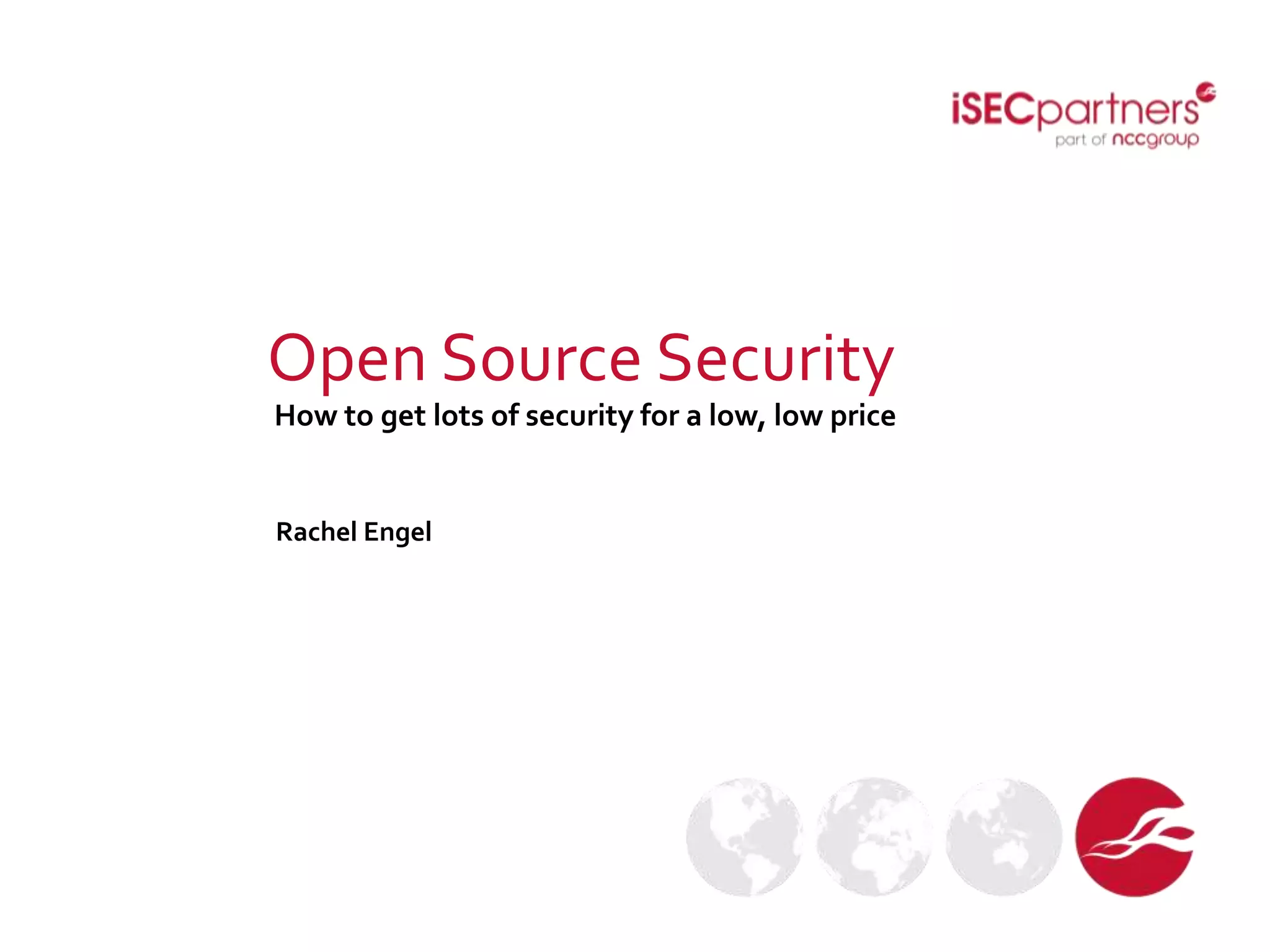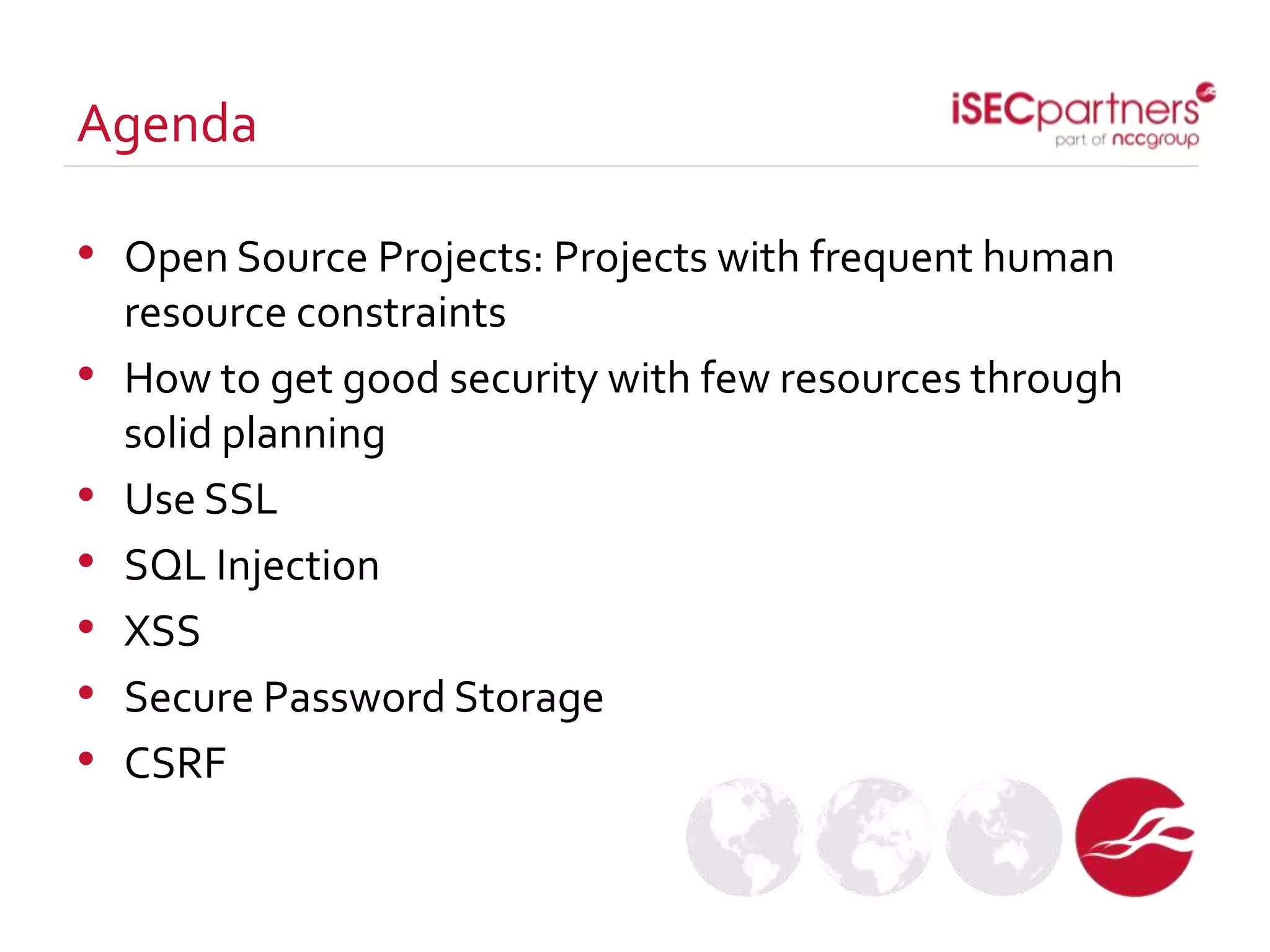 The document discusses how open source projects with limited resources can implement effective security measures. It recommends using SSL for all site traffic, parameterized queries to prevent SQL injection, encoding user input to prevent XSS, bcrypt or PBKDF2 with salts for secure password storage, and CSRF tokens for protection against cross-site request forgery. The key point is that planning for security early and implementing these strategies from the start is much more efficient than trying to retrofit protections later.